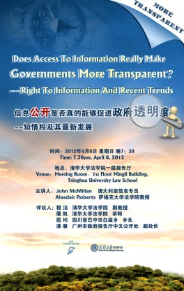I’ll be giving a public lecture in Beijing on April 8 with John McMillan, Information Commissioner of Australia. The lecture is organized by Tsinghua University Law School in conjunction with the Carter Center. We’ll also participate in an all-day forum at the law school on April 9.